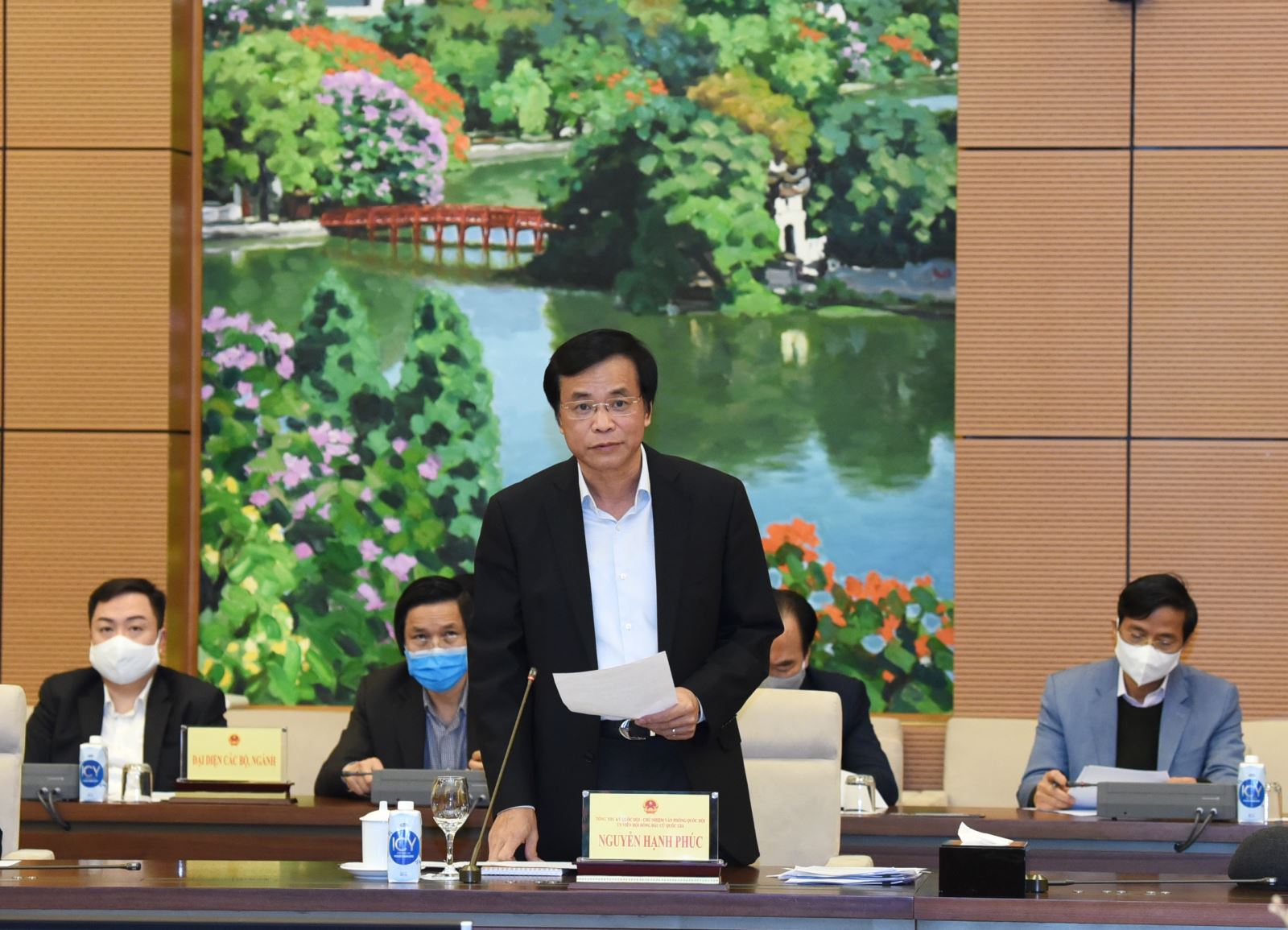 Tổng Thư ký Quốc hội, Chủ nhiệm Văn phòng Quốc hội, Chánh Văn phòng Hội đồng Bầu cử quốc gia Nguyễn Hạnh Phúc báo cáo tại Phiên họp. Ảnh: VGP/Nguyễn Hoàng