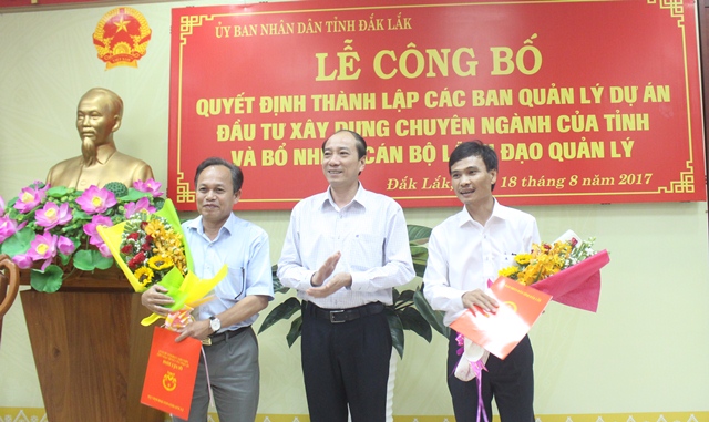Tại buổi Lễ, Phó Bí thư Tỉnh ủy, Chủ tịch UBND tỉnh Phạm Ngọc Nghị đã trao các Quyết định điều động, bổ nhiệm chức danh lãnh đạo, quản lý 02 Ban QLDAĐTXD gồm: Điều động và bổ nhiệm ông Phạm Văn Hạ – Trưởng phòng Kinh tế ngành, Sở Kế hoạch và Đầu tư giữ chức vụ Giám đốc và điều động, bổ nhiệm ông Phan Xuân Bách – Trưởng phòng Kinh tế đối ngoại, Sở Kế hoạch và Đầu tư giữ chức vụ Phó Giám đốc Ban QLDAĐTXD công trình giao thông và nông nghiệp phát triển nông thôn tỉnh Đắk Lắk, thời hạn giữ chức vụ 5 năm kể từ ngày 15/8/2017 đến ngày 15/8/2022; điều động và bổ nhiệm ông Lữ Ngọc Sinh – Trưởng phòng Đấu thầu, thẩm định và giám sát đầu tư, Sở Kế hoạch và Đầu tư giữ chức vụ Giám đốc và điều động, bổ nhiệm ông Võ Văn Lợi – Phó Trưởng Phòng Tài chính đầu tư, Sở Tài chính giữ chức vụ Phó Giám đốc Ban QLDAĐTXD công trình dân dụng và công nghiệp tỉnh Đắk Lắk, thời hạn giữ chức vụ 5 năm kể từ ngày 15/8/2017 đến ngày 15/8/2022; điều động và bổ nhiệm ông Trương Quốc Khả – Phó Chánh Thanh tra Sở Xây dựng giữ chức vụ Kế toán trưởng Ban QLDAĐTXD công trình dân dụng và công nghiệp tỉnh Đắk Lắk, thời hạn giữ chức vụ 5 năm kể từ ngày 18/8/2017 đến ngày 18/8/2022.