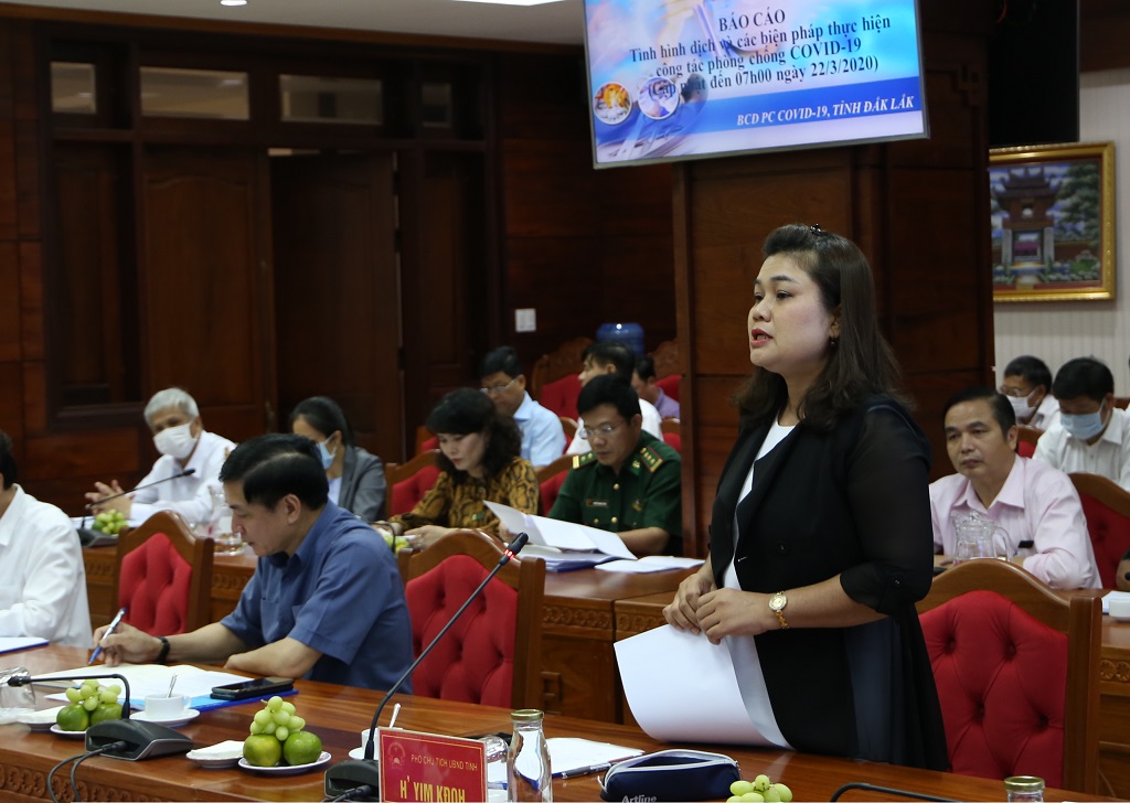 Phó Chủ tịch UBND tỉnh H’ Yim Kđoh, Trưởng Ban Chỉ đạo phòng chống dịch Covid-19 của tỉnh báo cáo tại buổi làm việc.