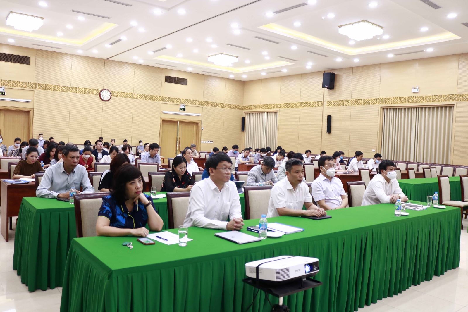 Thứ trưởng Bùi Hồng Minh và lãnh đạo các đơn vị thuộc Bộ Xây dựng tham dự Hội nghị tại điểm cầu Cơ quan Bộ Xây dựng