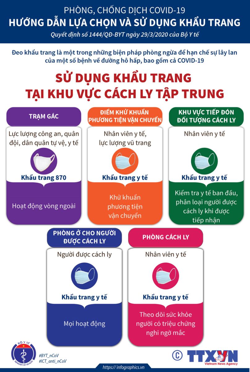 Ngày 13-4, Bộ Y tế phối hợp với Thông tấn xã Việt Nam xây dựng và cho ra mắt các infographic về việc hướng dẫn tạm thời lựa chọn và sử dụng khẩu trang cho từng đối tượng, từng trường hợp cụ thể để phòng, chống dịch Covid-19. Các infographic gồm: Nguyên tắc sử dụng khẩu trang; hướng dẫn sử dụng khẩu trang; sử dụng khẩu trang tại cộng đồng; sử dụng khẩu trang tại khu vực nhập cảnh; sử dụng khẩu trang tại khu vực cách ly tập trung; sử dụng khẩu trang của đội phản ứng nhanh; sử dụng khẩu trang tại khoa, phòng khám bệnh; sử dụng khẩu trang tại cơ sở điều trị nội trú.