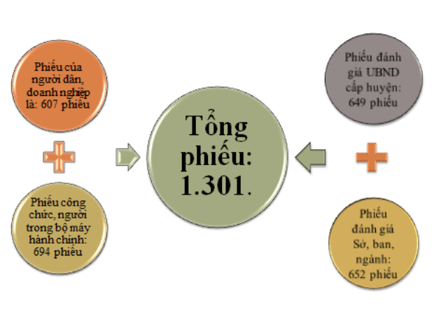 Tổng phiếu: 1.301. Trong đó: Cơ cấu phiếu theo đối tượng trả lời;Phiếu của người dân, doanh nghiệp là: 607 phiếu; Phiếu công chức, người trong bộ máy hành chính: 694 phiếu.