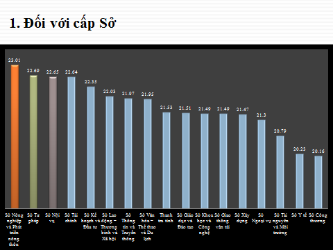 Kết quả điều tra xã hội học: Đối với cấp sở: Tổng điểm điều tra xã hội học của các sở trong khoảng từ 19 - 23 điểm trong thang điểm 25; trong đó 8/18 sở có điểm trong khoảng 21 - 22. Chênh lệch điểm số giữa đơn vị có điểm cao nhất (Sở Nông nghiệp và Phát triển nông thôn với 23,01 điểm) và đơn vị có điểm thấp nhất (Ban Dân tộc tỉnh với 19,74 điểm) là 3,27 điểm. Điểm điều tra XHH của các sở sắp xếp theo thứ tự từ cao đến thấp như sau: