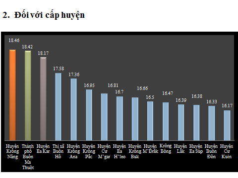 Đối với cấp huyện: Tổng điểm điều tra XHH của UBND các huyện, thị xã, thành phố nằm trong khoảng từ 16 – 18,42 điểm; trong đó chủ yếu tập trung mức điểm từ 16,19 – 16,95 điểm với 10/15 huyện thuộc khoảng này. Chênh lệch điểm số giữa địa phương có điểm cao nhất (huyện Krông Năng với 18,46 điểm) với địa phương có điểm thấp nhất (huyện Cư Kuin với 16,17 điểm) là 2,29 điểm. Điểm điều tra XHH của UBND các huyện, thị xã, thành phố sắp xếp theo thứ tự từ cao đến thấp như sau: