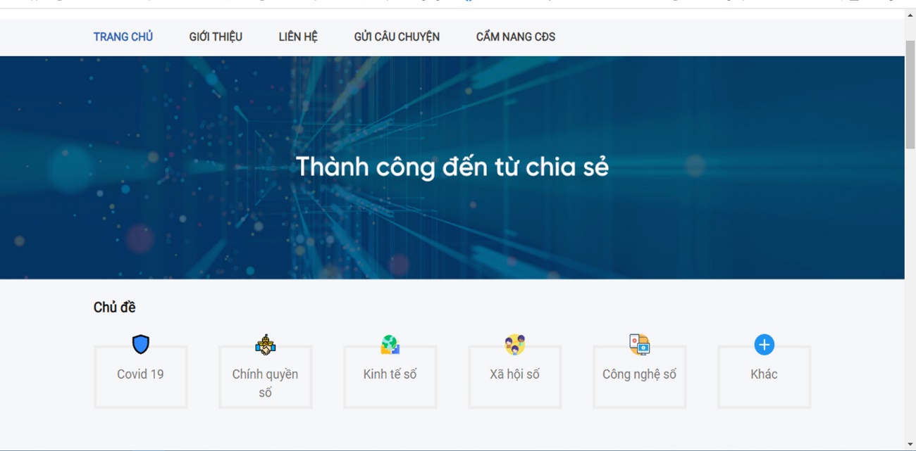 Bao gồm hơn 30 bài viết, câu chuyện của các địa phương về chuyển đổi số thông qua các chủ đề Covid-19, Chính phủ số, kinh tế số, xã hội số, công nghệ số,.. Ngoài ra, tại giao diện trang chủ có các thanh công cụ phục vụ nhu cầu tìm kiếm bài viết theo tiêu đề, chủ đề và địa phương. Tóm tắt các bài viết theo chủ đề: