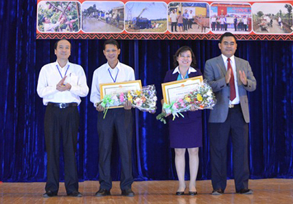 Ông Y Biêr Niê, Chủ tịch HĐND tỉnh (bên phải), ông Phạm Ngọc Nghị, Chủ tịch UBND tỉnh (bên trái) trao khen thưởng cho các tập thể xuất sắc.