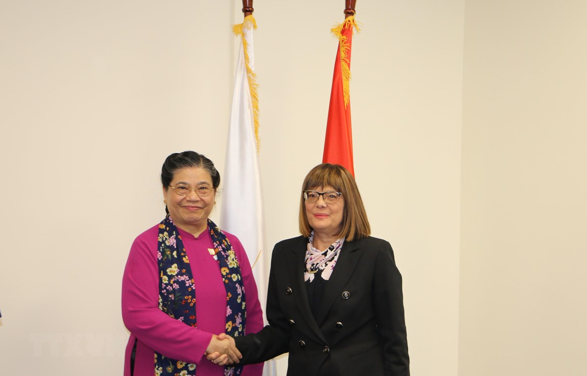 Phó Chủ tịch thường trực Quốc hội Tòng Thị Phóng hội kiến Chủ tịch Quốc hội Serbia Maja Gojkovic. Ảnh: TTXVN