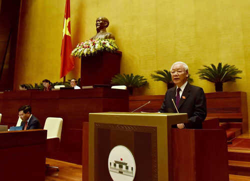 Tổng Bí thư, Chủ tịch nước Nguyễn Phú Trọng trình bày Tờ trình về việc đề nghị Quốc hội phê chuẩn Hiệp định CPTPP. Ảnh: VGP/Nhật Bắc