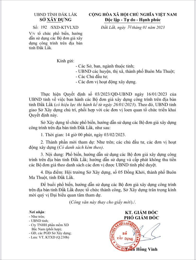 Để buổi phổ biến, hướng dẫn sử dụng các Bộ đơn giá xây dựng công trình trên địa bàn tỉnh Đắk Lắk được tổ chức thành công, Sở Xây dựng trân trọng kính mời quý vị Đại biểu quan tâm tham dự. Công văn này thay cho giấy mời./.