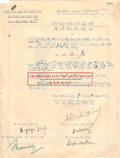 Tại Sắc lệnh Luật số 50 ngày 9/10/1945, lần đầu tiên 6 chữ “Độc lập - Tự do - Hạnh phúc” đứng trang trọng giữa đầu trang Sắc lệnh.