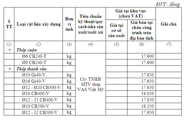 Ngày 16/6/2022, Sở Xây dựng nhận được báo giá thép của Công ty TNHH MTV thép VAS Việt Mỹ, căn cứ vào tình hình diễn biến giá thép trên thị trường và báo giá của nhà cung cấp, Sở Xây dựng Đắk Lắk công bố điều chỉnh giá thép (Chưa có thuế giá trị gia tăng) kể từ ngày 13/6/2022 đến khi có thông báo mới trong Công văn số 1490/SXD-KTVLXD ngày 10/6/2022 của Sở Xây dựng về việc công bố giá vật liệu xây dựng tháng 6/2022 để các cơ quan, tổ chức, cá nhân có liên quan tham khảo trong việc xác định giá xây dựng công trình như sau: