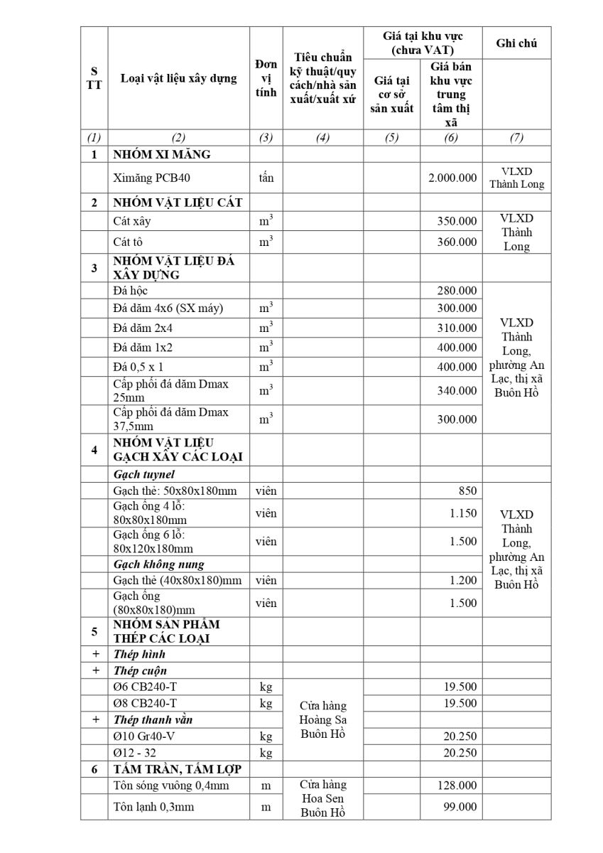 Thông báo điều chỉnh giá vật liệu xây dựng tại thị xã Buôn Hồ