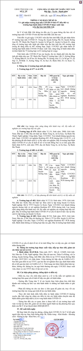 Thông cáo báo chí số 26 về việc ghi nhận trường hợp mắc COVID-19 thứ 477 đến 483 và các trường hợp bệnh nhân COVID-19 được xuất viện trên địa bàn tỉnh Đắk Lắk