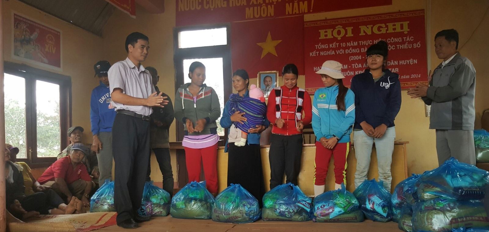 Nhân dịp này, hai đơn vị tặng buôn kết nghĩa 15 suất quà (mỗi suất trị giá 300.000 đồng) gồm gạo, dầu ăn, nước mắm và bánh kẹo cho 15 hộ nghèo trong buôn.