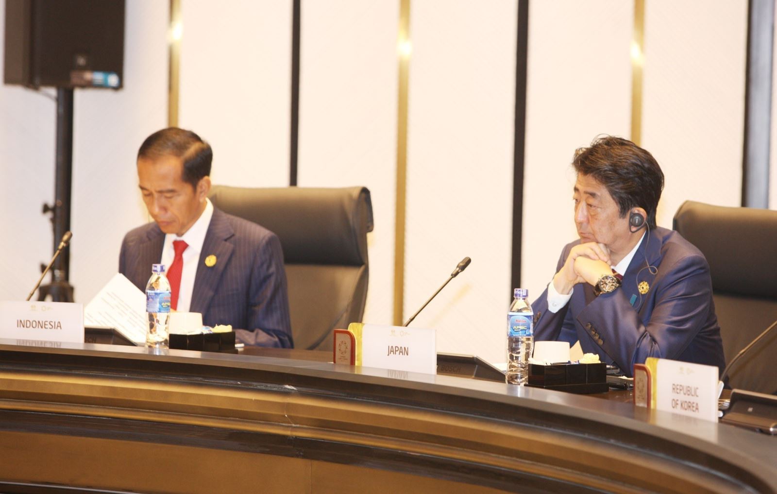 Tổng thống Indonesia Joko Wikodo và Thủ tướng Nhật Bản Shinzo Abe tại phiên họp.