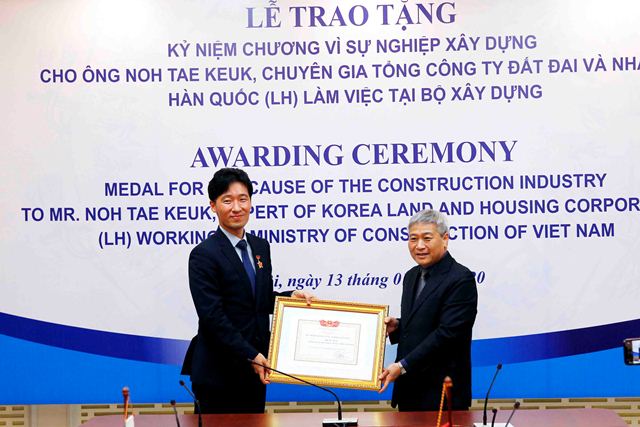 Ngày 13/1/2020, tại Hà Nội, Bộ Xây dựng tổ chức buổi lễ Trao tặng Kỷ niệm chương Vì sự nghiệp Xây dựng cho ông NOH TAE KEUK, chuyên gia Tổng công ty Đất đai và Nhà ở Hàn Quốc (LH) đang làm việc tại Bộ Xây dựng.