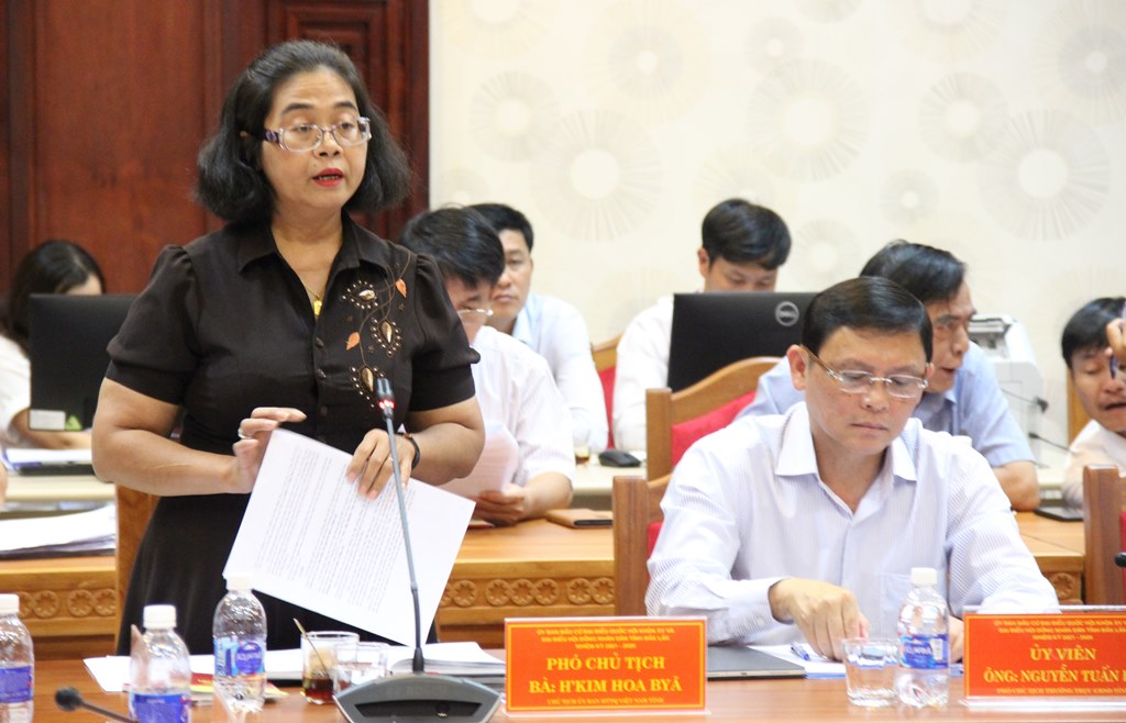 Đồng chí H’ Kim Hoa Byă - Trưởng Ban Dân vận Tỉnh ủy, Chủ tịch Ủy ban MTTQ Việt Nam tỉnh, Phó Chủ tịch Ủy ban Bầu cử tỉnh phát biểu tại phiên họp.